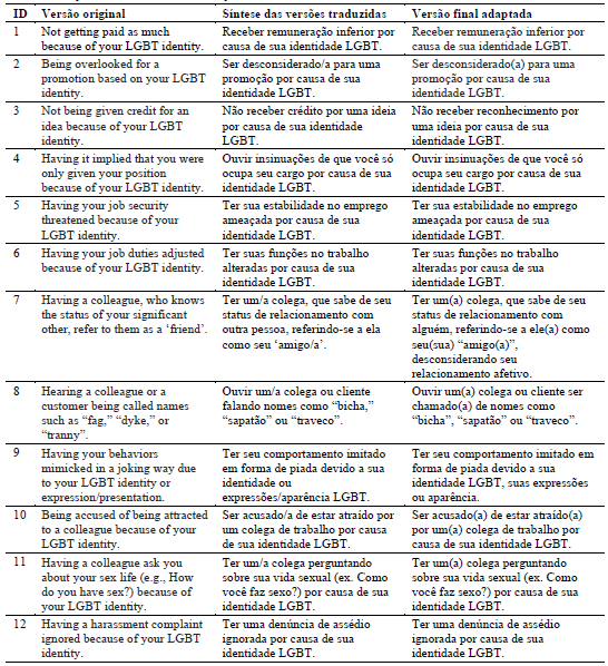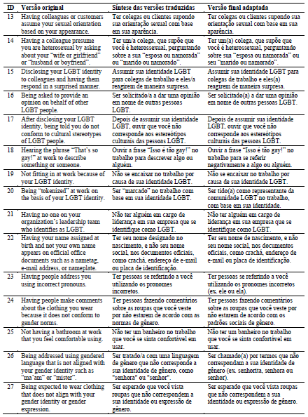 Na avaliação pelo público-alvo, os itens 3, 7, 9, 18, 23, 24 e 26 foram alterados. No item 3 (Não receber crédito por uma ideia por causa de sua identidade LGBT), o termo crédito foi alterado para reconhecimento. No item 7 (Ter um/a colega, que sabe de seu status de relacionamento com outra pessoa, referindo-se a ela como seu ‘amigo/a’), o trecho “desconsiderando seu relacionamento afetivo” foi incluído, enfatizando que é uma forma de minimizar o relacionamento. No item 9 (Ter seu comportamento imitado em forma de piada devido a sua identidade ou expressões/aparência LGBT), o final foi alterado para “identidade LGBT, suas expressões ou aparência”, facilitando a compreensão. No item 18 (Ouvir a frase “Isso é tão gay!” no trabalho para descrever algo ou alguém), o trecho “para se referir negativamente a” foi incluído, enfatizando a visão negativa. No item 23 (Ter pessoas se referindo a você utilizando os pronomes incorretos), exemplos “(ex. ele ou ela)” foram adicionados ao final da frase, facilitando o entendimento. No item 24 (Ter pessoas fazendo comentários sobre as roupas que você veste por não estarem de acordo com as normas de gênero), o termo normas foi alterado para padrões sociais, destacando que trata de questões sociais. O item 26 (Ser tratado/a com uma linguagem de gênero que não corresponde a sua identidade de gênero, como “senhora” ou “senhor”) foi alterado para “Ser chamado(a) por termos que não correspondam a sua identidade de gênero (ex. senhorita, senhora ou senhor)”, utilizando linguagem mais clara e acrescentando mais um exemplo. Quanto às flexões de gênero dos itens 2, 7, 8, 10,11, 14, 16, 20 e 26, barras foram substituídas por parênteses, melhorando a compreensão. A versão do público-alvo, correspondente à versão final adaptada, consta na Tabela 1.T2