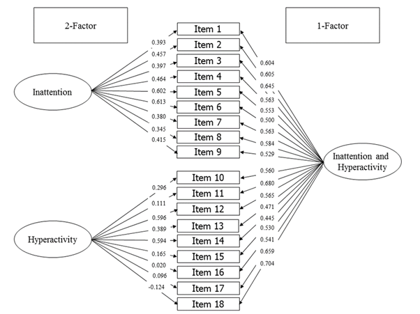 Other studies from different countries evaluated the internal validity of the ASRS-18. A Korean study (Kim et al., 2013), a Spanish study (Pérez & García, 2007) and an Argentine (Scandar, 2021) confirmed a two-factor model (Inattention and hyperactivity) using an EFA. A French study (Morin et al., 2016) and an Italian study (Somma et al., 2019), based on structural equation modeling, proposed a bifactor model, which allowed both interpretation of the ASRS, as two factors, such as a one-factor model with just one global score.