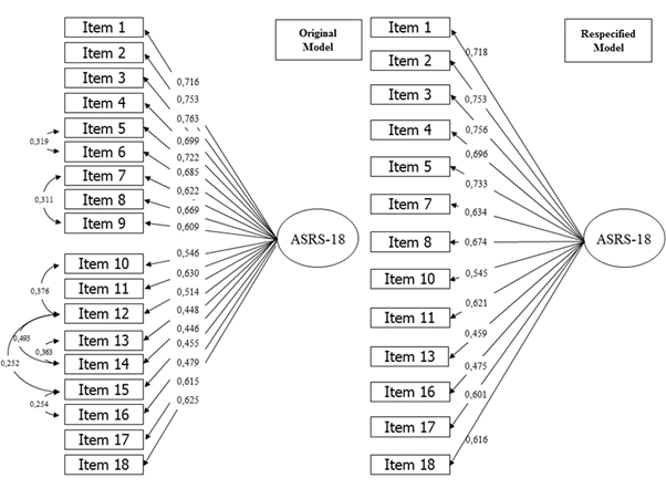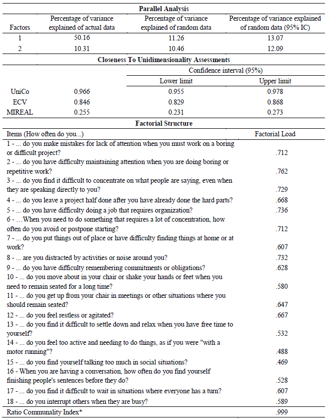 The aim of the present study was to analyze the psychometric properties of the ASRS-18, with emphasis on validity evidence based on the internal structure of the test, which supports a trend adopted by the DSM, a more dimensional view of disorders. (Narrow & Kuhl, 2011; Regier et al., 2013; Ruscio et al., 2011).