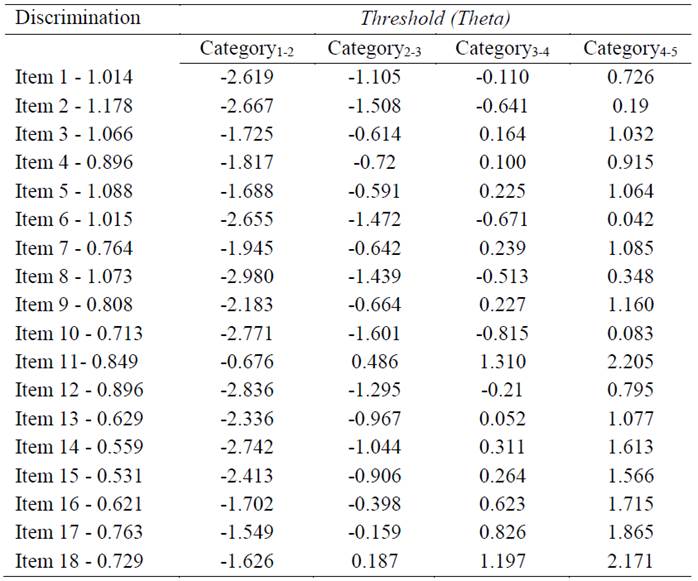 The indices of instrument adjustment, in the EFA, were adequate, demonstrating model plausibility, except for the Chi-square (Brown, 2006): X2 = 1304.833, gl = 135; p< .001; RMSEA = .089, 95 % CI (.078 - .094); CFI = .962 and TLI = .957. The H-index (H-Latent = 0.931, 95 % CI (0.924 - 0.936); H-Observed = 0.920, 95 % CI (0.913-0.926)) demonstrated that the items represent a single factor well (Hancock & Mueller, 2001). The composite reliability of the instrument showed a value of 0.924 (Valentini & Damásio, 2016). The indices of quality and effectiveness of the factorial scores: FDI (0.965), EAP marginal reliability (0.931), SR (3.671) and EPTD (94.1 %). Table 2 presents two IRT parameters, discrimination and Threshold (Reckase, 1985).