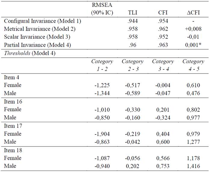 In conclusion, a multi-group confirmatory factor analysis (MGCFA) was performed on the total sample. For each model created a parameter is fixed (factor, factor load and thresholds) to evaluate its equivalence within the sex variable. Configural and metric invariance was obtained since the CFI increased from model 1 to model 2. The scalar invariance was borderline, once from model 2 to model 3 there was a 0.01 increase in CFI value. To investigate which items did not obtain equivalent thresholds between groups, a partial invariance model was created. Items 4, 16, 17 and 18 when free to vary within the sex category improved the model fit (ΔCFI = +0.001). The results are presented in Table 3.