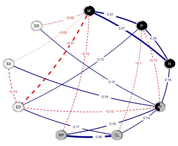 Por último, la Figura 3 indica en las esquinas superiores e inferiores que la conexión positiva significativamente más alta fue entre la claridad y reparación emocional (cuadrado en la esquina superior derecha), y la más alta negativa fue ente el maquiavelismo y edad (cuadrada en la esquina inferior izquierda).