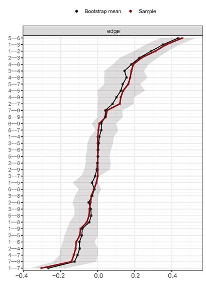 La Figura 2 demuestra la precisión de las asociaciones de red mediante bootstrapping, donde las estimaciones de la muestra del estudio (línea más ancha) coincide con aquellas del remuestreo con 1500 muestras (línea delgada).