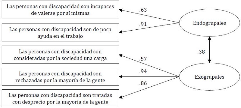 En primer lugar, se evaluó la confiabilidad de la escala utilizando el coeficiente Omega de McDonald, obteniendo un índice de confiabilidad de .75, lo que se considera aceptable. En seguida, se evaluó la validez de constructo a través de un análisis factorial confirmatorio (AFC), partiendo de la hipótesis de que las cinco preguntas de prejuicios se agrupan en una sola dimensión. El método de extracción fue diagonal weighted least squares, ya que se considera apropiado para variables dicotómicas (Cheng-Hsien, 2016). El modelo se evaluó mediante los siguientes índices de bondad de ajuste: chi cuadrado con probabilidad asociada (X², p) mayor que .05, general fit index (GFI) mayor que .95, error de la raíz cuadrada de la media de aproximación (RMSEA) con valores entre .05 y .08, raíz cuadrada de la media de residuos cuadrados (SRMR) cercano a 0.05 (Valdés-Cuervo et al., 2019). Dado que los índices de bondad de ajuste mostraron resultados poco favorables, se optó por probar una solución bifactorial. La presencia de un factor con dos ítems se justifica siempre y cuando la correlación sea alta entre ellos y baja con el resto, y se sostenga la interpretabilidad del factor (Worthington & Whittaker, 2006). Al primer factor se le nombró prejuicios endogrupales, ya que representan juicios que las PD hacen sobre sus propias capacidades y quedó formado por las preguntas 1 y 2. Al segundo factor se le nombró prejuicios exogrupales, puesto que representan juicios que las PD adjudican a la sociedad o a otras personas, y quedó formado por las preguntas 3, 4 y 5. En este caso, la correlación entre el reactivo 1 y 2 (endogrupales) fue moderada (.57), mientras que con el resto fue baja (de entre .38 a .18). La literatura señala que la prueba X² puede llevar a rechazar soluciones razonablemente apropiadas cuando se trabaja con muestras grandes, por lo tanto, al observar que el resto de los indicadores mostraron un buen ajuste, se decidió retener el modelo. Los resultados de ambos modelos pueden visualizarse en la Tabla 3. La estructura del modelo bifactorial, la covarianza estandarizada entre los factores y los coeficientes de explicación de cada una de las preguntas se observa en la Figura 1.
