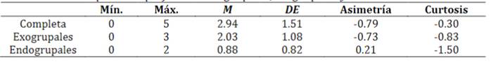 En primer lugar, se llevaron a cabo análisis descriptivos con la escala completa de prejuicios, así como con las variables de prejuicios exogrupales y endogrupales. Las puntuaciones de la escala completa indican que los participantes contestaron que “sí” en promedio a 3 de las 5 afirmaciones, lo que sugiere un nivel moderado de prejuicios interiorizados sobre las personas con discapacidad. La puntuación de prejuicios exogrupales se encuentra por encima de la media teórica, a diferencia de la puntuación de prejuicios endogrupales, que se encuentra por debajo. Por otra parte, las puntuaciones de asimetría y curtosis sugieren una distribución normal (ver Tabla 4).