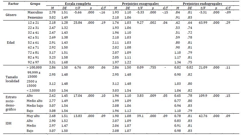 Se obtuvieron los siguientes resultados: escala total t = -6.20; p < .001; d = -0.25, prejuicios exogrupales t = -4.12; p < .001; d = -0.16, y prejuicios endogrupales t = -5.98; p < .001; d = 0.24. Se observa un valor práctico para la escala total y prejuicios endogrupales, con mayores puntuaciones de prejuicios para los participantes que se encuentran en localidades con un nivel de IDH bajo.