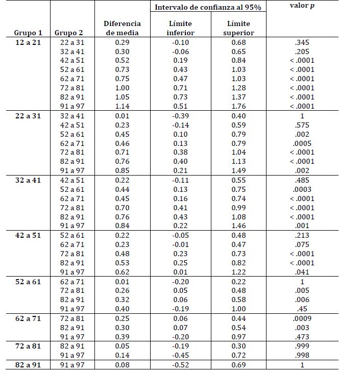 Posteriormente, se llevaron a cabo las comparaciones de medias entre grupos para la escala completa y prejuicios exogrupales y endogrupales, cuyos resultados se encuentran detallados en la Tabla 5. Respecto a los resultados por género, aunque se obtuvieron diferencias significativas tanto en la escala completa como en prejuicios exogrupales y endogrupales, con una puntuación mayor las mujeres (lo que indica que en general perciben más prejuicios), el tamaño del efecto no alcanzó el mínimo aceptable, lo que significa que no tiene un valor práctico. Posteriormente, se comparó a los participantes por edad. Se obtuvieron diferencias significativas para la escala completa y los prejuicios endogrupales y exogrupales. Sin embargo, el tamaño del efecto solo alcanzó un valor práctico para la escala total y para los prejuicios endogrupales. El análisis post hoc mostró que existen diferencias significativas entre múltiples grupos etarios, con la constante de que los prejuicios aumentan con la edad. Las diferencias entre grupos pueden apreciarse en la Tabla 6.