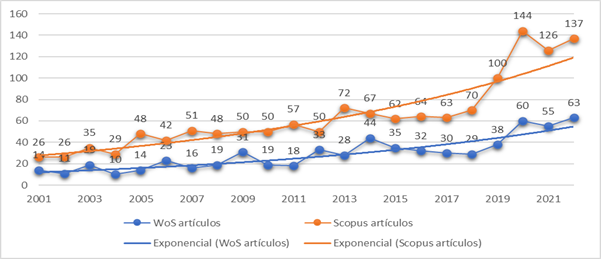 En la Figura 1 se evidencia la producción científica anual, entre 2001 y 2022, publicada en las bases de datos de Scopus y WoS sobre suicidio y riesgo suicida en la infancia y la adolescencia. Se observó un incremento anual del 7.42 % en WoS y del 8.24 % en Scopus en el número de publicaciones científicas entre 2001 y 2021. Se destaca que la tasa de producción por año es exponencial y constante en ambas bases de datos, lo que evidencia un área de investigación consolidada y de continua producción científica.