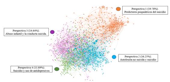 La Figura 3 muestra los clústeres dominantes de la red final en la que se identificaron cuatro clústeres principales que representan las tendencias de investigación. Estos clústeres permiten visualizar el comportamiento de la producción de conocimiento en cada una de las perspectivas halladas. El Clúster 1 representa el 19.78 % de la red y se orienta a estudios sobre predictores clínicos de la conducta suicida, la cual contempla la ideación y el intento de suicidio en la niñez y adolescencia, así como problemas psiquiátricos (depresión y ansiedad). El Clúster 2 representa el 16.25 % y agrupa estudios sobre las autolesiones no suicidas y su relación con la conducta suicida. La autolesión no suicida hace referencia a comportamientos autodestructivos que involucran el daño físico autoinfligido, sin la intención de causar la muerte (Mars et al., 2019). En contraste, el comportamiento suicida involucra pensamientos, fantasías y deseos de muerte, hasta llegar al intento y el suicidio consumado (Stewart et al., 2017).