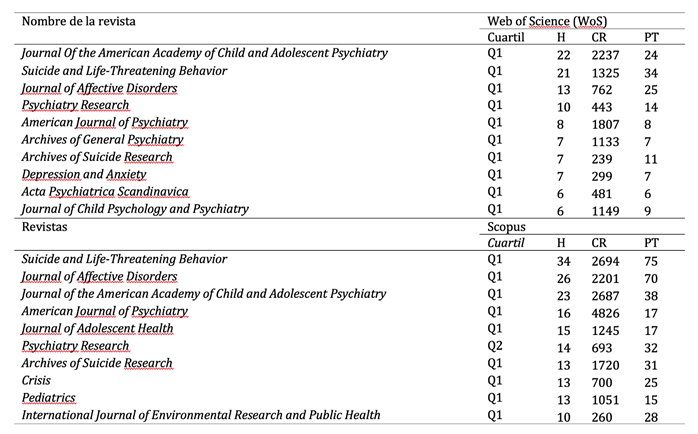 En la Tabla 1 se presentan las diez revistas científicas indexadas más reconocidas dentro del campo de estudio y consultadas en las bases de datos de WoS y Scopus. Se encontró que la revista Suicide and Life-Threatening Behavior presenta la mayor cantidad de publicaciones (WoS = 34, Scopus = 75), el Journal of the American Academy of Child and Adolescent Psychiatry tiene el mayor número de citas recibidas en WoS (n= 2,237) y el American Journal of Psychiatry tiene el mayor número de citas recibidas en Scopus (n= 4,826). Se resalta que la producción científica sobre el suicidio en la niñez y la adolescencia se encuentra publicada en revistas de alto impacto (Q1), lo que denota la importancia de estudiar dicho fenómeno.