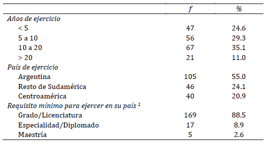 La Tabla 2 informa sobre aspectos del ejercicio profesional. Un 75 % de los encuestados contaban con cinco o más años de ejercicio profesional, e informaron diferentes requisitos para la realización de evaluaciones psicológicas en contextos jurídicos donde ejercían su práctica profesional. El requisito mínimo reportado se asoció con la región del profesional (x2(4) = 13.80, p = .008). Un 17.5 % de los profesionales de Centroamérica reportó que era necesario contar con especialidad o nivel superior, mientras que esa proporción fue de 15.2 % en el resto de Sudamérica y de 7.7 % en Argentina. Notablemente, en ningún caso la totalidad de participantes de un mismo país o región coincidieron en el requisito mínimo requerido. Por el contrario, sus respuestas se dispersaron a lo largo de las diferentes categorías. Aquellos con un nivel educativo más alto tendieron a informar un nivel mínimo requerido más restrictivo (es decir, un mayor grado académico) que el informado por aquellos con un grado académico más bajo (c2(8) = 32.19, p < .001).