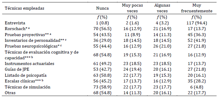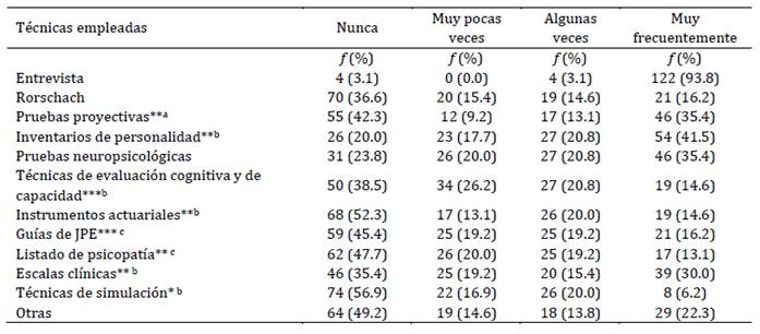 En las últimas tres décadas se han realizado estudios que administran encuestas a muestras de profesionales para conocer en qué medida sus prácticas se adecúan a dichos protocolos y lineamientos. Una de las encuestas más referenciada se realizó a mediados de los años 90 a una muestra de 200 psicólogos y psiquiatras forenses de Estados Unidos (Borum & Grisso, 1995). Las técnicas más empleadas fueron las pruebas de inteligencia y cognitivas, principalmente, la Escala Wechsler de Inteligencia para Adultos (WAIS; Wechsler, 1981) y las pruebas objetivas de personalidad, principalmente el Inventario Multifásico de Personalidad de Minnesota (MMPI; Hathaway, 1982) y aproximadamente un cuarto de los profesionales reportó emplear pruebas proyectivas. Años más tarde, en otra encuesta en ese país más del 80 % de una muestra compuesta por 64 psicólogos forenses acreditados indicaron que, mientras que las pruebas psicométricas como el WAIS y las escalas MMPI eran aceptables y recomendables en evaluaciones requeridas en contextos jurídicos, las técnicas proyectivas resultaban inaceptables en ese ámbito, y entre el 52 % y el 63 % consideró inaceptable el test de Rorschach (Lally, 2003).