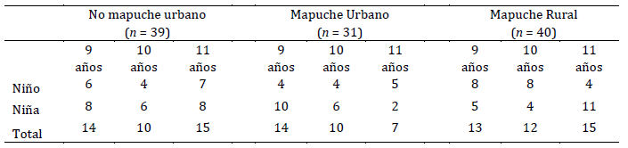 Se realizó un muestreo por conveniencia seleccionando un total de 110 niños de entre 9 y 11 años, perteneciente a tres grupos culturales: 39 niños no mapuche urbanos, 31 niños mapuche urbanos y 40 niños mapuche rurales. Tanto en el grupo rural como en el grupo urbano la pertenencia al pueblo mapuche fue determinada por autoadscripción. Se excluyeron de la muestra a niños que no cumplían con los criterios de pertenencia al pueblo mapuche o de nacionalidad chilena, que estuvieran fuera del rango etario de interés, o que tuvieran algún trastorno del desarrollo, como discapacidad cognitiva o motora. La distribución de los grupos según edad y sexo se presenta en la Tabla 1.