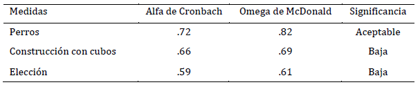 Los instrumentos no cuentan con una confiabilidad previamente definida en grupos de niños mapuche rurales y mapuche urbanos; por lo tanto, se aplicó análisis de consistencia interna con alfa de Cronbach. También se aplicó análisis con omega de McDonald, pues midió la confiabilidad sin depender del número de ítems (Ventura-León & Caycho-Rodríguez, 2017). Si bien la confiabilidad de todos los ítems no fue aceptable, dado el tamaño muestral y que el estudio es incipiente en el contexto nacional la consistencia interna obtenida se puede considerar confiable de acuerdo a la línea exploratoria de este estudio (Tabla 2).