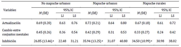 En la variable actualización fueron los niños mapuche urbanos quienes tuvieron una media mayor, es decir, estos niños tuvieron más actualización en comparación con los otros dos grupos. Respecto del cambio entre conjuntos mentales, fueron los niños no mapuche quienes tuvieron un mejor desempeño en comparación con los niños mapuche urbanos y los niños mapuche rurales. En inhibición ocurrió una situación similar a la anterior, puesto que los niños no mapuche tuvieron menor puntaje, por lo tanto mayor inhibición, puesto que tardaron menos tiempo en la prueba.