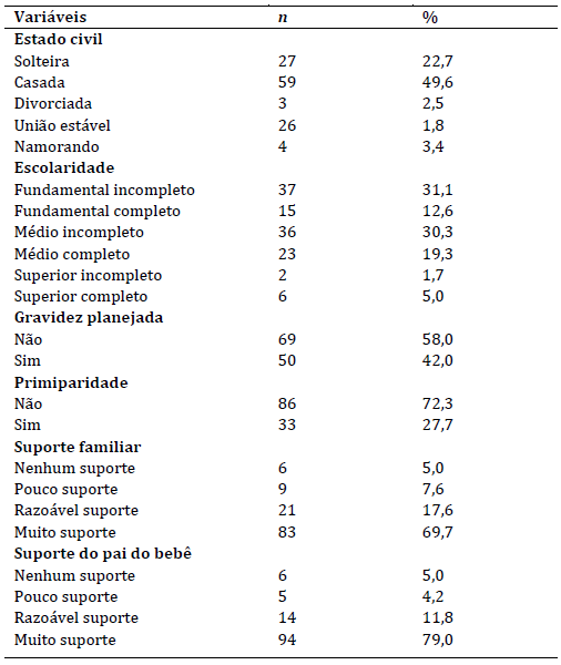Participaram da pesquisa 119 gestantes com idades entre 18 e 45 anos (M = 30,45; DP = 6,58) e idade gestacional entre 27 e 40 semanas (M = 32,53; DP = 4,03) que estavam em acompanhamento pré-natal de alto risco. Como critérios de inclusão, integraram a amostra mulheres acima de 18 anos com gestação a partir da vigésima sétima semana uma vez que, a partir deste período, a vinculação materno-fetal torna-se mais evidente (Lima et al., 2022; Rosa et al., 2021). Para serem classificadas como “alto risco”, a gestante deveria ter sido diagnosticada por um profissional da medicina que indicasse tal condição. Não foram feitas restrições ou categorizações com relação às diferentes condições (e.g. hipertensão arterial e diabetes gestacional) que pudessem levar ao diagnóstico de risco gestacional. Foram excluídas gestantes com atrasos no desenvolvimento cognitivo, grau moderado/grave de perda auditiva ou afonia (mudez), uma vez que não há adaptação dos instrumentos para as necessidades específicas destas populações. A Tabela 1 apresenta a caracterização das participantes quanto ao estado civil, escolaridade, suporte familiar, suporte do pai do bebê, planejamento da gravidez e primiparidade.