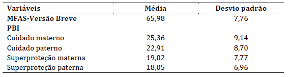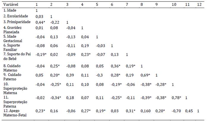 Os primeiros resultados analisados foram as estatísticas descritivas das variáveis apego materno-fetal (MFAS-Versão Breve) e percepção do vínculo parental (PBI). Os valores estão apresentados na Tabela 2. Em seguida, foram realizadas correlações entre as variáveis sociodemográficas, gestacionais, a percepção do vínculo parental e o apego materno-fetal. Os resultados estão apresentados na Tabela 3.