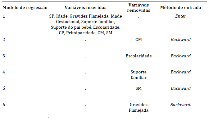 Posteriormente, foi realizada análise de regressão linear múltipla tendo como variável de desfecho o apego materno-fetal. Para realização da análise foi preciso verificar os pressupostos da regressão. O resultado do teste de Kolmogorov-Smirnov (p > 0,05) indicou a normalidade dos resíduos, o coeficiente D (Durbin-Watson) foi igual a 1,993 e valores de VIF variaram entre 1,04 e 1,33, o que indica que os dados preenchem os critérios necessários para que a análise seja conduzida. A Tabela 4 apresenta o processo de inserção e remoção de variáveis a partir do método backward.