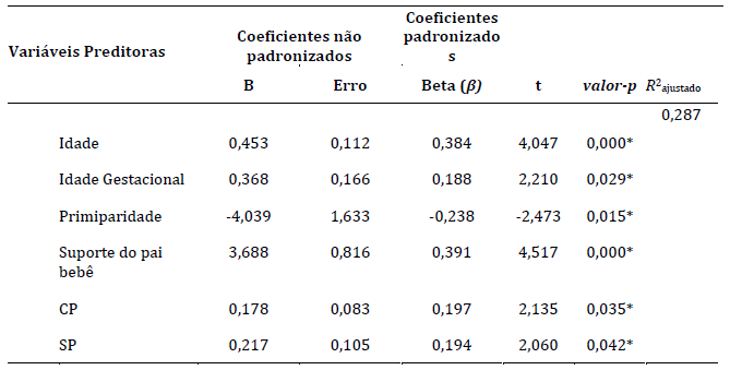 O modelo final (6) da análise de regressão linear múltipla (método backward) tendo como variável de desfecho o AMF apresentou resultado estatisticamente significativo (F (6, 97) = 7,893; p< 0,001; R2ajustado = 0,287), explicando 28,7 % da variância do AMF. As variáveis que compuseram este modelo, em ordem decrescente de contribuição individual (coeficiente padronizado β) , foram: suporte do pai do bebê, idade, primiparidade, cuidado paterno, superproteção paterna e idade gestacional. Os coeficientes da análise de regressão que compuseram o modelo final podem ser observados na Tabela 5.
