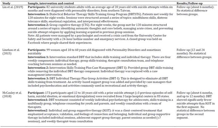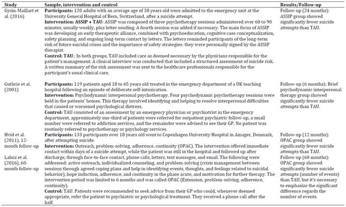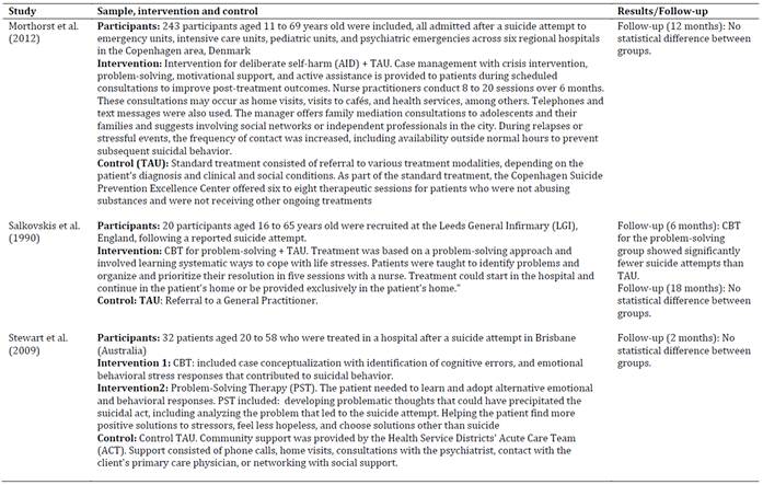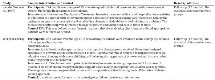 The inclusion criteria were studies with a randomized clinical trial design, which investigate psychotherapies to reduce suicide attempts in populations presenting prior attempts. Interventions not classified as psychotherapy, but with similar elements were also included, as well as the surveys in which suicide attempt was a main or secondary outcome. Study participants were older than eleven years and there was no defined follow-up period and time or language filter. No selected article was presented in a language other than English.