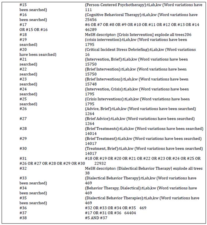 Exclusion criteria were studies with specific treatments or preventative measures in school environments; single psychoeducation sessions; interventions involving only monitoring and assessment of suicide risk with visits or phone calls; interventions in which there was only one session to encourage participation, continuity of care or assessment of suicide risk; isolated interventions with cards, crisis cards, and gatekeepers. Furthermore, articles not available online or free of charge were excluded.