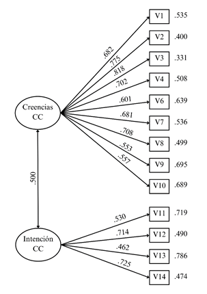 Inicialmente, se realizó un AFC con los 15 ítems originales y se obtuvo un ajuste insuficiente según los criterios de Hair et al. (2010). Los resultados fueron: χ²(89) = 728.100, p= .000; RMSEA = .095 (IC del 95 % = .088 - .101); TLI = .839; CFI = .864; y SRMR = .079. Por otro lado, los coeficientes de consistencia interna (α) fueron: α= .823 para la subescala de creencias y α= .711 para la subescala de intención, lo que sugiere una consistencia interna aceptable para creencias, pero marginal para intención.