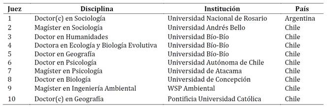 Para este proceso evaluativo se contó con la colaboración de diez jueces expertos con formación posgradual y al menos cinco años de experiencia en docencia e investigación en el ámbito socioambiental (Tabla 1). De estos jueces, nueve eran hombres y una era mujer. Siete de ellos habían obtenido o estaban cursando un doctorado, mientras que los tres restantes poseían un título de magíster. Es crucial destacar que estos jueces no formaban parte del equipo de investigación y participaron de manera voluntaria y gratuita en el estudio.