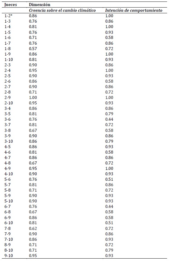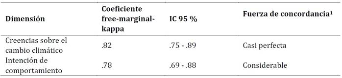 En segundo lugar, la concordancia de Kappa entre los pares de expertos evaluadores alcanzó niveles casi perfectos tanto en la dimensión relacionada con las creencias como en la dimensión de intención de comportamiento (ver detalle en Apéndice A).