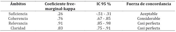 Validez de contenido. Se analizó mediante el coeficiente de Kappa multirater marginal-libre de Randolph (2005), calculado mediante la fórmula de variación de Gwet (2010), a través de una calculadora en línea de Kappa (Randolph, 2008). Los valores del coeficiente oscilan entre 0 y 1 y se interpretan según los siguientes rangos de fuerza de concordancia: (a) .00 = pobre, (b) .10 - .20 = leve, (c) .21 - .40 = aceptable, (d) .41 - .60 = moderada, (e) .61 - .80 = considerable, y (f) .81 - 1.0 = casi perfecta (Landis & Koch, 1977).