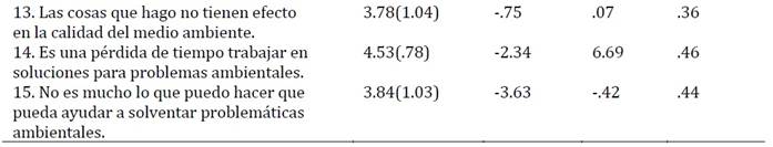 El AFC evidenció un buen ajuste del modelo de 13 ítems, lo que refuerza la validez de la nueva estructura interna de la escala. Aunque se realizó un ajuste específico en el ítem 11, que pasó de la dimensión de intención a creencias, es importante continuar evaluando si este cambio mejora efectivamente la coherencia conceptual del modelo, dado que el ítem aborda aspectos cognitivos del conocimiento ambiental.