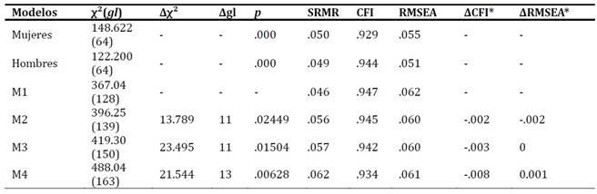 Se llevó a cabo un análisis de invarianza de medida para evaluar progresivamente la invarianza configural (M1), umbrales (M2) y cargas factoriales (M3), siguiendo a Wu y Estabrook (2016). Debido a la naturaleza ordinal de las variables, se utilizó el estimador robusto WLSMV (Brown, 2015). Los resultados del modelo base sin restricciones para ambos grupos (M1) se presentan en la Tabla 5 y muestran excelentes índices de ajuste (CFI = .947, RMSEA = .062, SRMR = .046). Este modelo sirvió como referencia para los modelos M2 y M3. En el modelo M2, que examina la invarianza de los umbrales, se observaron buenos índices de ajuste (CFI = .945, RMSEA = .060, SRMR = .056) y cambios mínimos en comparación con M1, lo que respalda la invarianza de los umbrales. El modelo M3, que evalúa la invarianza de las cargas factoriales, también mostró buenos índices de ajuste (CFI = .942, RMSEA = .060, SRMR = .057), con diferencias mínimas respecto de M1, lo que indica la invarianza de las cargas factoriales. Para evaluar la invarianza estructural, se estableció un modelo adicional (M4) con varianzas factoriales iguales entre los grupos. Los valores obtenidos (CFI = .934, RMSEA = .061, SRMR = .062) no superaron las diferencias mínimas recomendadas, lo que sugiere que se cumple la invarianza estructural. En resumen, los análisis de invarianza mostraron buenos ajustes en los modelos evaluados, respaldando la invarianza de medida a nivel configural, umbrales y cargas factoriales.