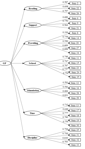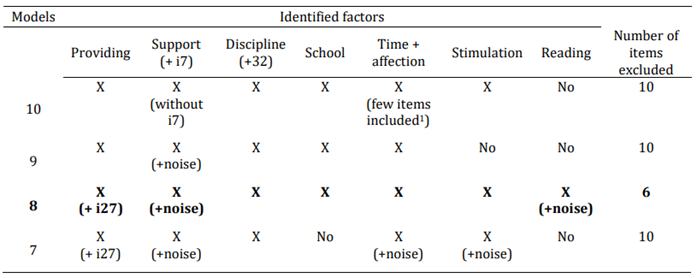 The analysis of the factor loadings of the models showed that, despite the specific differences of each model, seven dimensions of the quality of parental involvement (indicated in Table 3) were consistently found. Among them, some represent factors present in the IFI-BR-27: (a) Providing, (b) Mother/father support, with the addition of an item with theoretical relevance (7: Being involved in the daily or regular routine of taking care of your children’s basic needs or activities), (c) Discipline and teaching responsibility, with the addition of a theoretically appropriate item (32: Explain to your child why you consider some behaviors as being wrong), (d) Reading and homework support, (e) School encouragement and (f) a factor that would be the combination of items that reflect the content of the factors Time and talking together and Praise and affection.