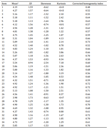 Table 1 presents the preliminary descriptive results on the items, considering the total study sample. As can be seen, the average values ranged from 3.98 to 5.54. Additionally, the lowest value of the corrected homogeneity index that was verified was 0.48.