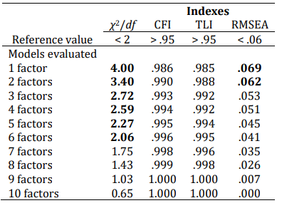 Bartlett's sphericity tests (6994.1, df = 595; p < .001) and KMO (0.93) suggested interpretability of the item correlation matrix. In the different exploratory factor analysis carried out, the results of the Parallel Analysis indicated the unifactorial structure as being the most representative of the data. Thus, models indicating from 10 to one factor were tested. Table 2 presents the adjustment indicators verified in each model.
