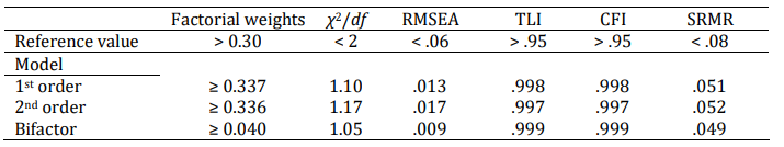 Initially, the internal structure derived from the EFA was evaluated through a CFA, performed using the JASP software (version 0.14.1) and with a sample composed of 623 parents. The analysis was performed using the Robust Diagonally Weighted Least Squares (RDWLS) estimation method, based on the polychoric correlation matrices (Asparouhov & Muthén, 2010). Three different models of internal structure were evaluated: (a) first order model (correlated factors), (b) second order model (hierarchical) and (c) bifactor model.