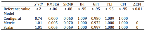 The same fit indices (χ2/df, CFI, TLI and RMSEA) and assessment criteria previously used were also used in the assessment of the CFA. Additionally, the Standardized Root Mean Square Residual (SRMR) was also evaluated, for which the evaluation criterion was to be values lower than .08 (Kline, 2011). To assess the invariance between the groups (fathers and mothers), the differences in the CFI values between the three evaluated models (configural, metric and scalar) were evaluated. Differences of up to 0.01 indicate the invariance of the model with the greatest parameter restriction, between the two models compared (Milfont & Fischer, 2010).