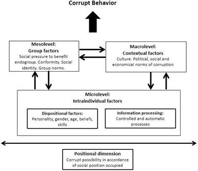 Corruption has been defined as the abuse of entrusted power for private gain and is investigated by different areas (e.g., economics, political science, business and psychology) at different levels of analysis (e.g., micro, meso and macro levels; Ashforth et al., 2008; Collier, 2002). Considering the importance of an interdisciplinary and multilevel model for studying the phenomenon (Vilanova et al., 2022), the Analytical Model of Corruption (AMC) was proposed (Modesto & Pilati, 2020). The model has proven suitable for studying the phenomenon in cross-cultural research according to previous studies that performed comparisons between countries (Modesto et al., 2020). The AMC can be visualized in Figure 1.