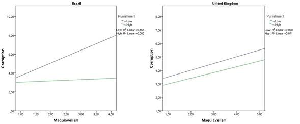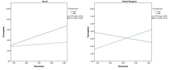 As shown in Figure 3, in Brazil, when perceived punishment is low, narcissism is positively related to corruption (R² = .15). However, when the perception of punishment is high, this relationship becomes irrelevant (R² = .01). For the United Kingdom, when perceived punishment is low, narcissism has a negative association with corruption (R² = .02). However, the relationship becomes positive when perceived punishment is high (R² = .14). In other words, the direction of the relationship between narcissism and corruption changes depending on whether punishment scores are low or high.