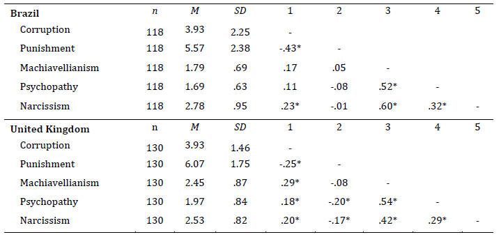 Corruption is a worldwide issue with vast negative consequences, such as hindering countries' economic growth, promoting higher inequality, and increasing death rates (Hanf et al., 2011; Mauro, 1995; Tanzi, 1998). Seeking to further understand this phenomenon, the present research aimed to investigate the moderating effect of perceived punishment on the relationship between personality traits (based on the Dark Triad model) and corruption in countries with different corruption indices (i.e., Brazil and the United Kingdom).