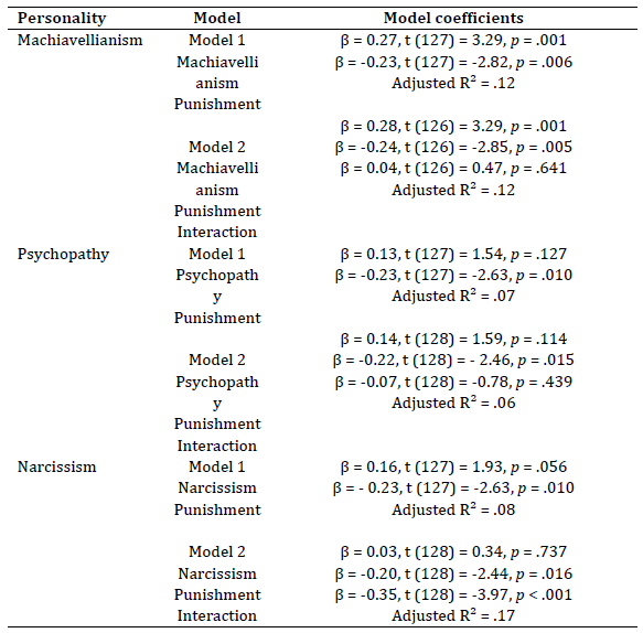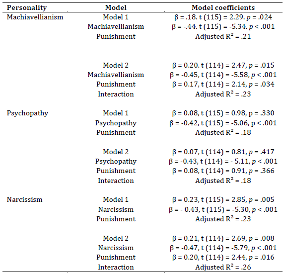 A series of linear regressions were conducted to test the main research hypotheses. As recommended by the literature (Aiken & Stephen, 1991), the scores of each personality dimension (Machiavellianism, psychopathy, narcissism) and perceived punishment were centralized. In addition, an interaction term was included between the DT traits and perceived punishment to test for the moderation effects in each country. In the first step of the multiple linear regressions, each dimension of DT trait and perceived punishment indices were included in the model. The same variables and the interaction terms were entered in the second step. The results of the linear regressions can be seen in Tables 2 and 3.