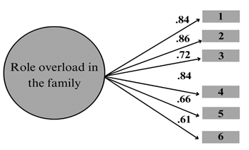 Initially, the single-factor structure of the Family Role Overload Scale was tested using CFA. The results showed that this structure had good fit indices: χ²(df) = 84.94 (9); CFI = .986; TLI = .977; RMSEA = .066 (.044-.091), as well as high standardized factor loadings (.61 to .86). The internal consistency indices were also adequate: .87 (Cronbach's Alpha) and .87 (McDonald's Omega). The results then showed that the Brazilian version of the Family Role Overload Scale remained with the six items from the original version, distributed in one dimension, which corroborates Hypothesis 1. Table 1 shows the description of the items, with their respective standardized factor loadings, mean and standard deviation. Figure 1 shows the graphical representation of the final model of the Family Role Overload Scale.