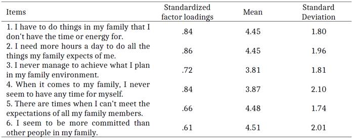 Marks and MacDermid's (1996) study involved 65 married female workers with at least one child under the age of 18 living at home in the United Kingdom. The results of the confirmatory factor analysis (CFA) showed a version of eight items and one factor. The internal consistency index (Cronbach's alpha) was .89. Maher et al. (1997) conducted a study with a sample of 155 American female university students. The results of the CFA showed a version of seven items and one factor. The internal consistency index (Cronbach's alpha) was .89. In the study by Thiagarajan et al. (2006), a sample of 535 single parents was used. The CFA showed a version of six items and one factor. The internal consistency index (Cronbach's alpha) was .89.