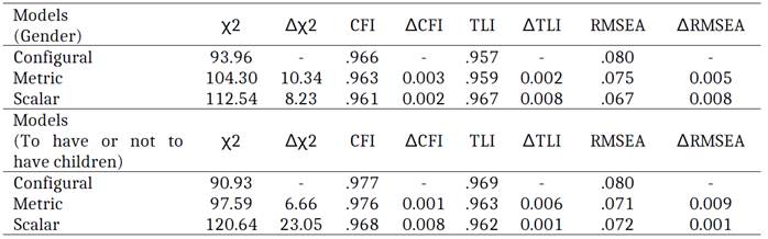 The invariance of an instrument is an important technique in the development and use of psychometric instruments, as it allows conclusions to be drawn about the invariance of the instrument's configuration and parameters in different groups, which will enable its future use in those groups (Fischer & Karl, 2019). Two different groups were compared and subdivided according to gender and the existence of children. With regard to gender, it was observed that social changes and the inclusion of women in the labour market have changed both men's and women's routines. As a result, women now have less time to dedicate to the family and men have to dedicate themselves more actively to family life. However, women continue to be primarily responsible for household chores and consequently experience greater stress when performing their roles in the family than men (Garcia & Marcondes, 2022).
