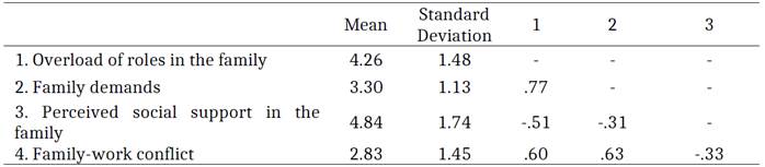 To obtain evidence based on correlations with related constructs, the following constructs were used: perceived family demands, family-work conflict, and perceived social support in the family. Perceived family demands refer to the subject's perception of their level of responsibility in their family (Gabardo-Martins & Ferreira, 2019). Considering that both role overload and perceived family demands can be considered stressors in the family context, it would be expected that these variables would be positively correlated. With this in mind, the following hypothesis was formulated: