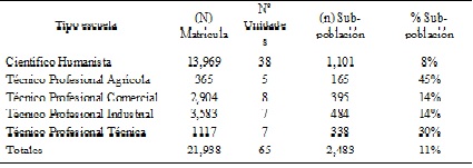Cabe destacar que la inclusión de los participantes de acuerdo al diseño muestral presentó dificultades respecto de la autorización requerida a algunos de los Directores de los Centros Escolares. Considerando este problema, se optó por reponer aleatoriamente unidades muestrales, obteniendo finalmente un tamaño adecuado y representativo del 7.07% de la población y un 62.1% de la muestra inicial.