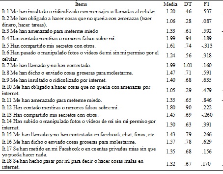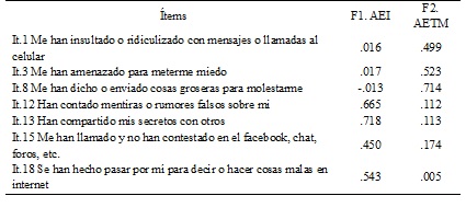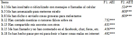 Análisis factorial exploratorio. Teniendo en cuenta los factores encontrados en España y México (Buelga et al., 2012), se procedió a comprobar la hipótesis de bidimensionalidad con los 18 ítems de la escala. Los resultados de la prueba de adecuación muestral KMO (.861) y la prueba de esfericidad de Bartlett χ2 (gl=153) = 4371.1 p < .001 avalan la pertinencia de realizar un análisis factorial exploratorio. Los resultados del análisis minimum rank factor analysis y la rotación promin, mostraron la presencia de dos factores que en total explicaron un 39.9% de la varianza total del constructo. Sin embargo, al analizar los resultados de las saturaciones factoriales es posible observar una inconsistencia significativa con la propuesta teórica original, lo que evidencia que el contenido conceptual de algunos ítems no fue comprendido por los estudiantes (véase Tabla 2).