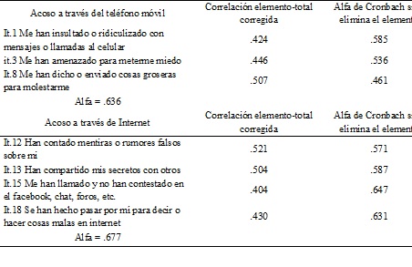 Consistencia interna y homogeneidad. El análisis de consistencia interna medida a través del coeficiente alfa de Cronbach, revela que la escala CYBVIC mide el maltrato escolar a través de internet (alfa = .677) y a través del teléfono móvil (alfa = .636) de manera precisa. Cabe destacar, que si se elimina cualquiera de los ítems seleccionados, el nivel de precisión de la escala disminuye significativamente (véase Tabla 5).