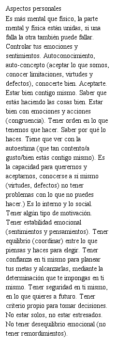Las descripciones que proporcionaron los jóvenes se organizaron en cinco rubros: sentirse bien, bienestar, BP, aspectos necesarios para tener BP y aspectos que obstaculizan el BP. Se identificaron dos elementos importantes: los aspectos personales (emociones, conductas, sentimientos) y los contextuales (familia, pares–amigos y/o novio, escuela y sociedad), los primeros se presentan en la Figura 1 y los contextuales en la Figura 2.