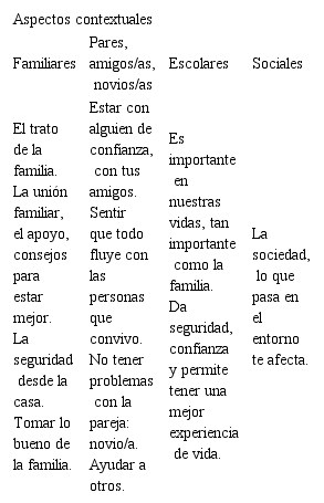 Sus objetivos fueron: a) identificar el significado que tiene para algunos adolescentes los términos bienestar y BP, y b) identificar los aspectos/dimensiones individuales y contextuales que asocian los adolescentes como necesarios para favorecer el BP, así como aquéllos que lo obstaculizan.