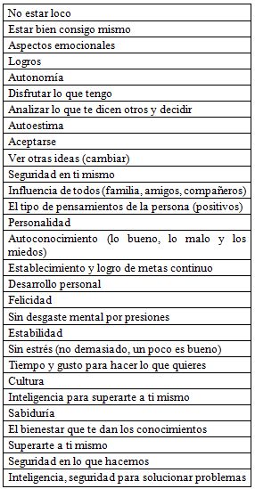 El resumen de las palabras que los adolescentes asociaron con BP se presenta en la Figura 3. Algunas de las palabras que los jóvenes emplearon con más frecuencia fueron: aceptarse, auto-conocimiento, estar bien consigo mismo, logros, disfrutar lo que tengo, autoestima y seguridad en ti mismo.